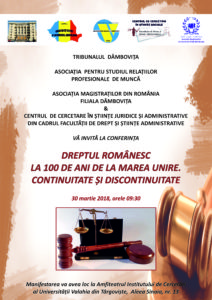 CONFERINŢĂ 30 MARTIE – DREPTUL ROMÂNESC LA 100 DE ANI DE LA MAREA UNIRE. CONTINUITATE ȘI DISCONTINUITATE