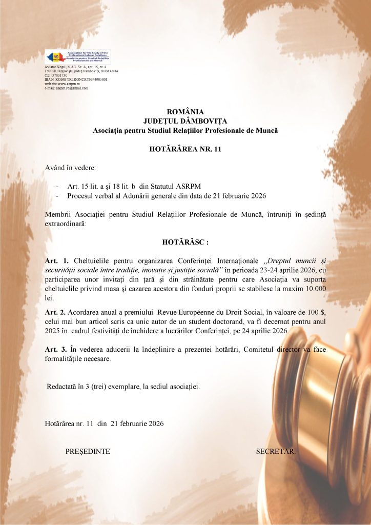 On behalf of, Association for the Study of the Professional Labour Relations Târgovişte
